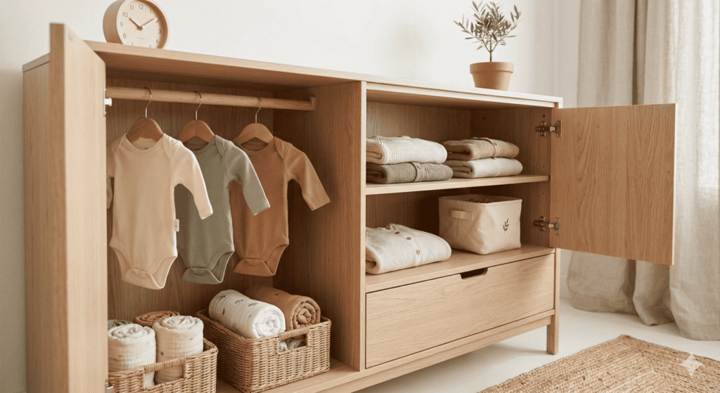 - Sustainable Bins: Pair your wardrobe with wicker or organic cotton bins to categorize sizes (0–3 months, 3–6 months) without the plastic waste.