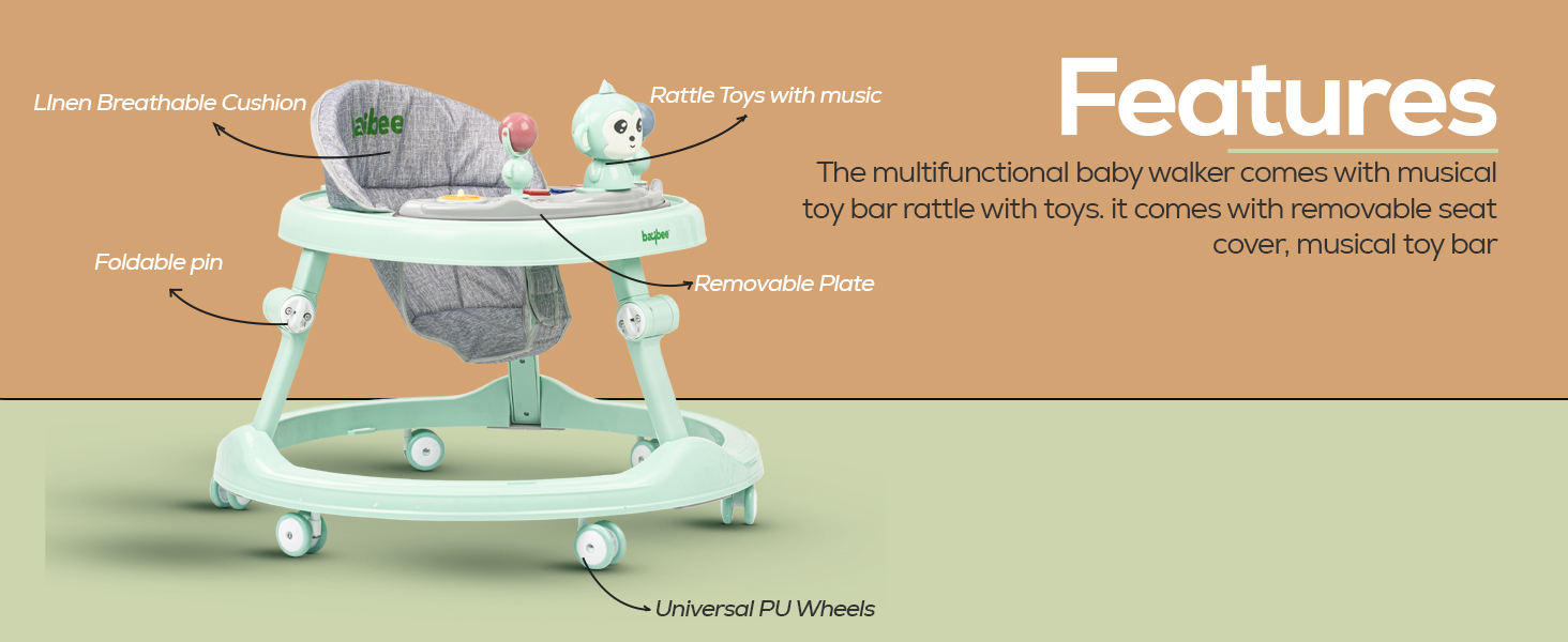 Enhanced Mobility and Safety: The baby-walker Featuring a robust round design, this baby walker is equipped with six silent, universal wheels that enable smooth, multidirectional movement, allowing your child to navigate through narrow and tight spaces effortlessly. The quiet wheels ensure that your child’s exploration is both safe and peaceful, without causing any disturbance.