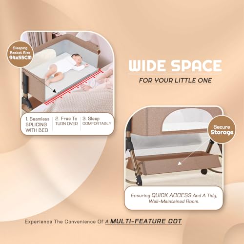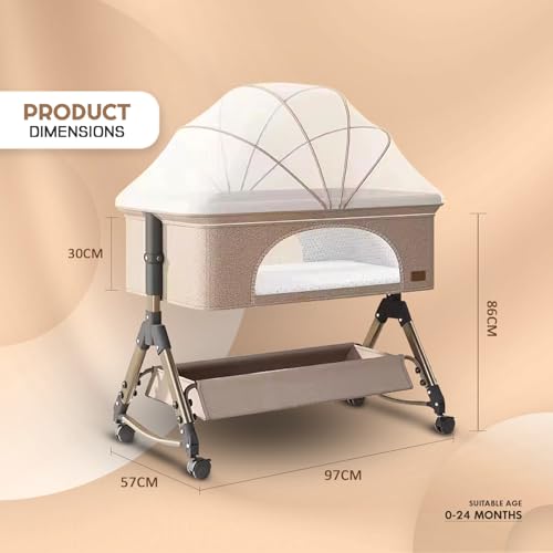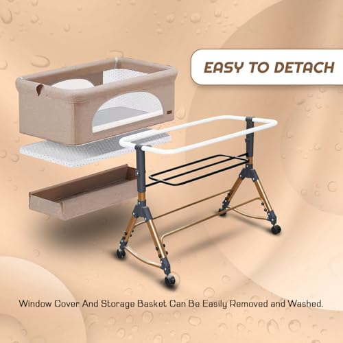 CAREIT Comfortable 6-in-1 Baby Cot, Crib, Bedside Bassinet, Adjustable Height, Mosquito Net, Storage Basket, Wheels, and Mattress | Easy Folding, Unique Design (Beige) Alloy Steel