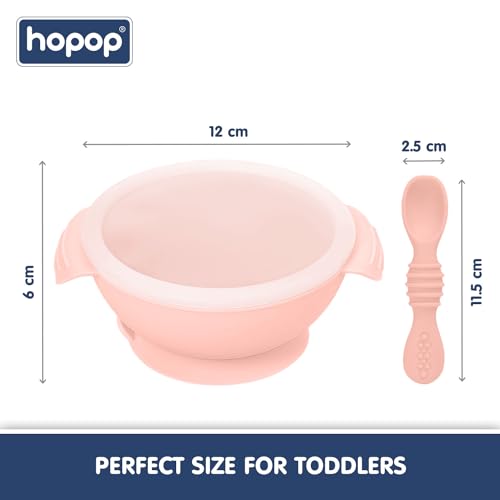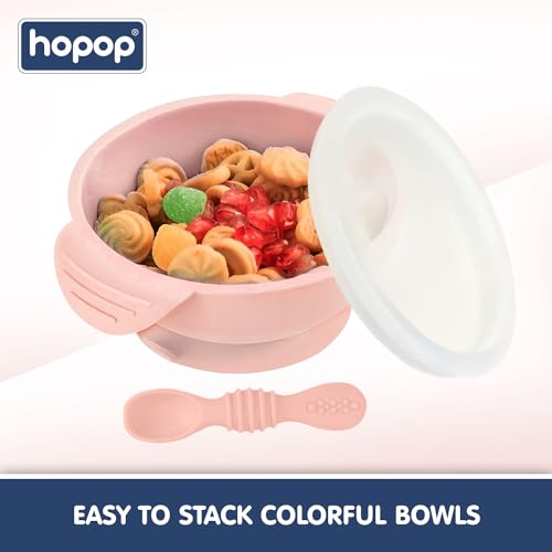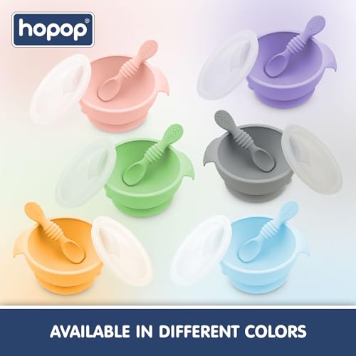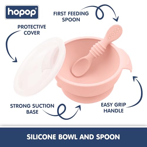 CONVENIENT FEEDING SOLUTION: Hopop Silicone Bowl offers a convenient solution for parents during feeding time. Its strong suction base keeps the bowl in place, reducing spills and mess.The included first spoon with a smooth, rounded tip is gentle on baby’s gums and teeth. A snap-on lid makes it ideal for food storage, perfect for on-the-go parents. Easy to clean and store, this bowl is a practical choice for busy parents.