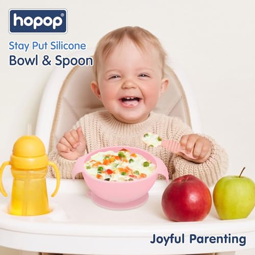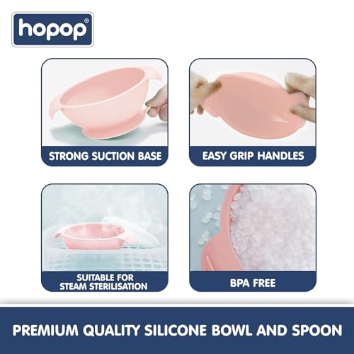 IDEAL FOR WEANING:Transitioning to solids is easier with the Hopop Silicone Bowl and first spoon set.The strong suction base keeps the bowl in place, reducing spills and mess.The first spoon’s smooth, rounded tip is gentle on baby’s gums and teeth.