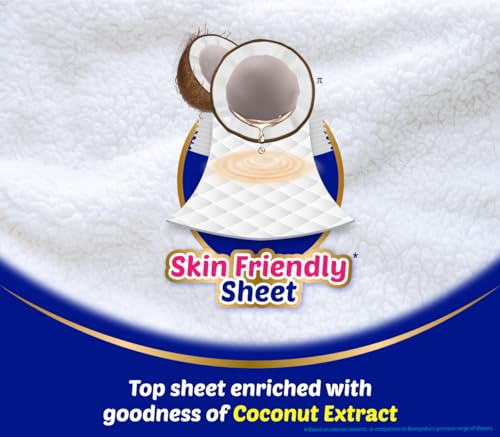 Skin Friendly diaper – The topsheet is enriched with the goodness of coconut extracts which nourishes and soothes skin. It helps in preventing rashes.