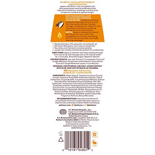 Palmer’s Cocoa Butter Formula Length Retention system with Biotin, fully strengthens hair with powerhouse natural protectants that help block fragileness, brittleness, breakage and split ends, to help hair achieve its optimal length. This creamy, silicone free, non stripping , color safe shampoo, gently lifts away oil, dirt and build up with strengthening protectants, while leaving strands perfectly prepared for conditioning.