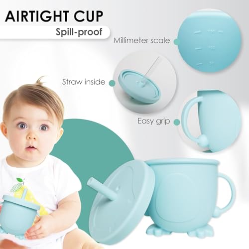 QLECT BPA Free Silicone Baby Feeding Set,Baby Led Weaning Supplies,Eating Essentials Utensils with Suction Plate & Bowl,Pocket Bib,Sippy Cup with Lid,Forks Spoons for Baby&Toddler 6+ Months,Blue