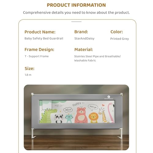 StarAndDaisy Bed Guard for Baby/Kids with T- Body Support Frame, Adjustable Height/Portable Single Side Bed Rail for Infants & Toddler’s Safety (Printed Grey-1.8 M)
