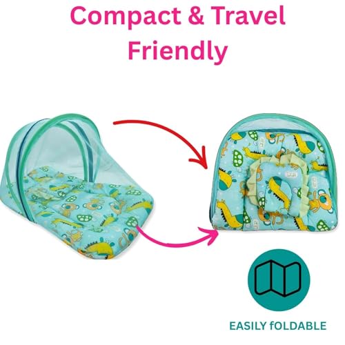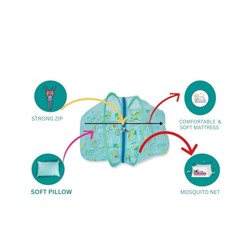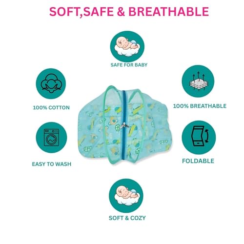 Soft cushioned mattressHigh-quality mosquito netSkin-friendly, breathable fabricProtects from insects and bugsLightweight and portableEasy to fold and carryWashable and reusable designStrong, durable stitchingProper ventilation for comfortBaby-safe vibrant prints