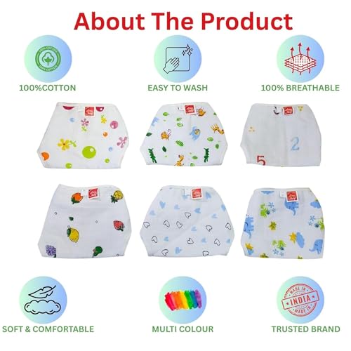 Pure cotton fabricGentle on baby’s sensitive skinSoft, breathable, and lightweightPrevents rashes and irritationEasy-to-tie knot closureWashable and quick-dryingAdorable, colorful printsEnsures maximum airflowPerfect fit for newborns & infantsProvides freedom of movement